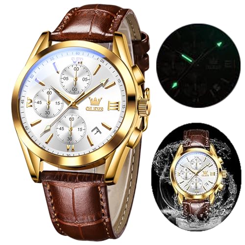 OLEVS Herrklocka – kvarts-kronograf med läderarmband, guldfärgad boett i rostfritt stål med datum, självlysande, stilren/casual