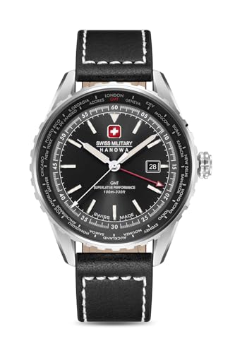 Swiss Military Hanowa Afterburn GMT herrklocka med läderarmband eller metallband med datum och safirglas, Svart läderrem, Rem