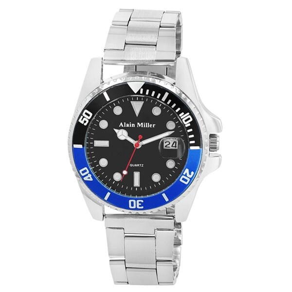 Alain Miller herrklocka i rostfritt stål / Armbandsur med datum - silver/svart/blå