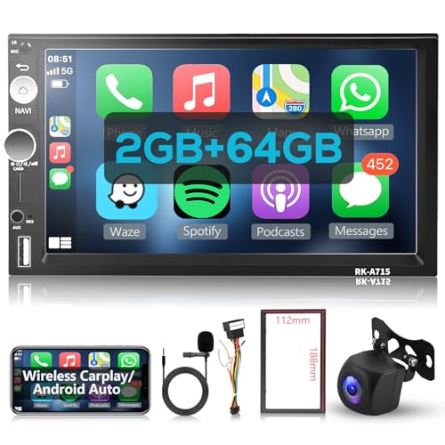 Hodozzy 2G+64G Android bilradio 2 din Carplay trådlös Android Auto, radiobil, Android 7" pekskärm med GPS-spegellänk Bluetooth, HiFi, FM/RDS radio, wifi, USB, AHD backkamera