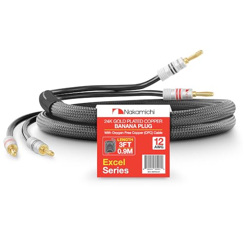 Nakamichi Excel-serien 24k förgyllda banankontakter med (3 fot) högtalarkabel i 99.9% syrefri koppar (OFC) kraftig flätad för förstärkare Hi-Fi hemmabio - Svart (12AWG / 3ft / 0.9m)