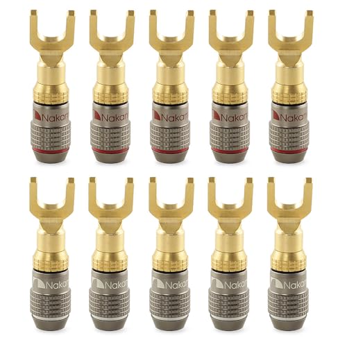 Nakamichi FanLock Excel Series 24K guldpläterad spade bananplugg kontaktdon 10 AWG - 18 AWG Mått 4mm för Högtalarkabel hemmabio Hi-Fi förstärkare och ljudsystem snabbanslutning, 10 st (5-par)