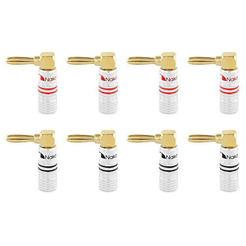 Nakamichi Excel Series 24K guldpläterad bananplugg 12 AWG - 18 AWG Gauge Storlek 4 mm för högtalare Förstärkare Hi-Fi AV-mottagare Stereo Hemmabio Ljudkabel Kabel Skruvkontakt (8 st (4-par), Rät Vinklad bananplugg)