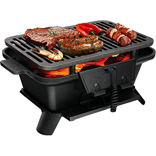 Gjutjärnsgrill, bärbar förkryddad kolgrillspis med dubbelsidigt grillgaller inomhus utomhus Hibachi för camping picknickfest,Black