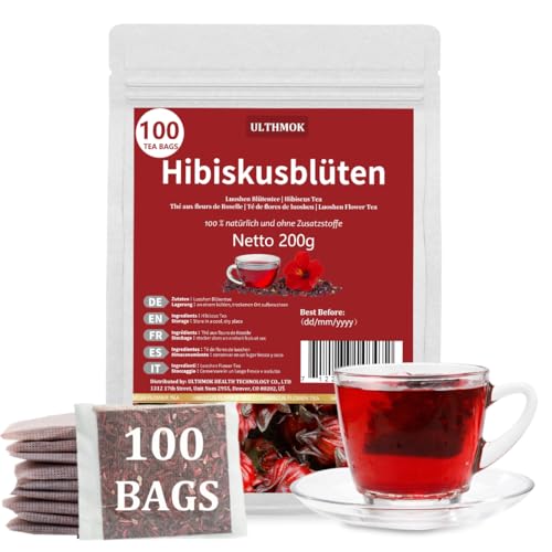 ULTHMOK Premium Hibiskus Te Påsar - 100% Rena Torkade Hibiskus Blommor, Naturliga och Tillsatsfria, Koffeinfria - 100 Te Påsar/200g