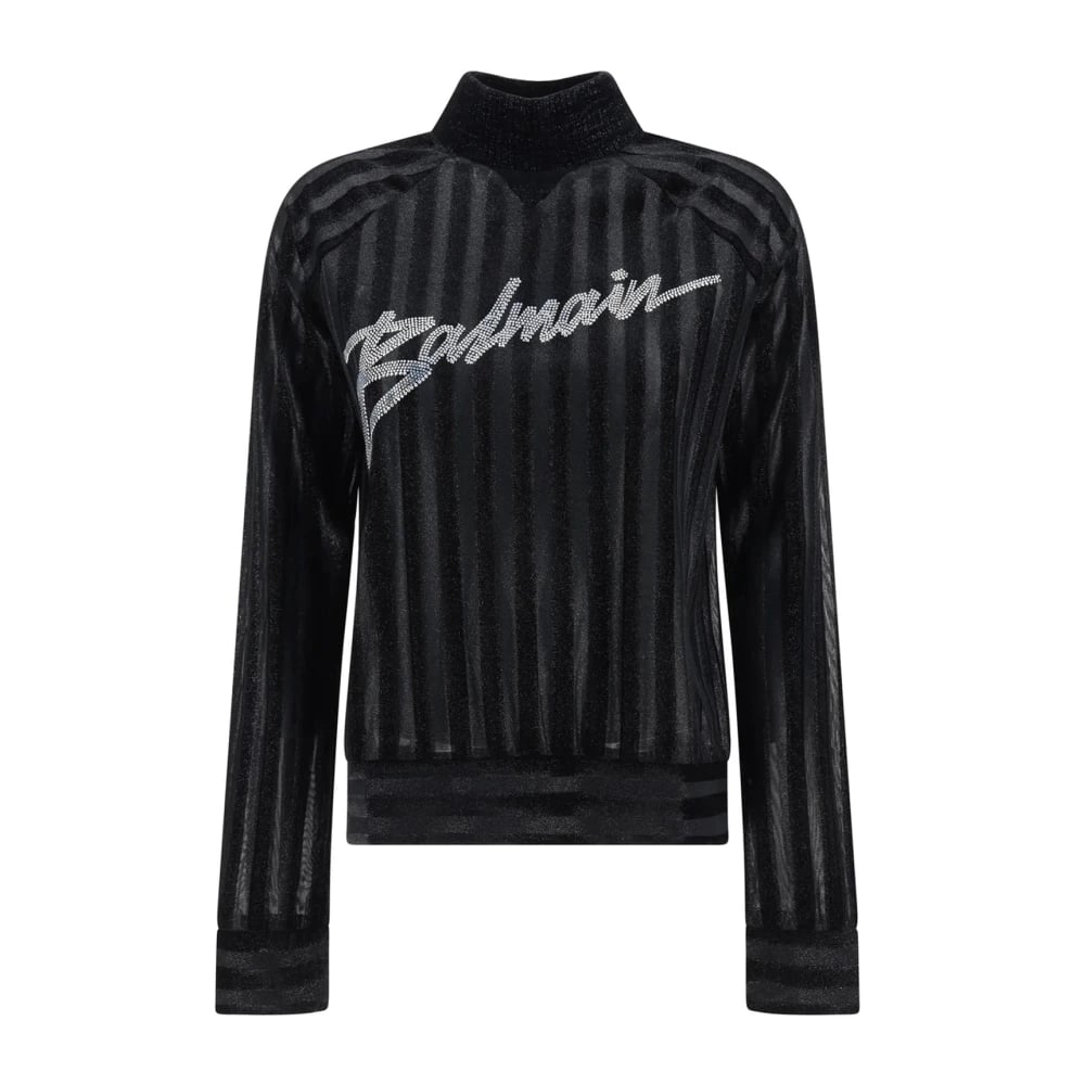Balmain, Stickade Tröjor , Dam, L, Polyester, High-Neck Logo Sweater