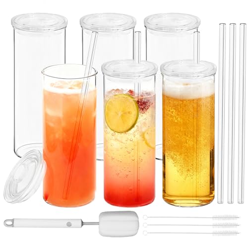 16oz Highball glasögon uppsättning av 6 med locken, tjockt labb-klass borosilikatglas, diskmaskin mikrovågsfrys säker, innehåller glas rengöringsborste, bly-fri för iskaffe, juice, whisky, cocktails