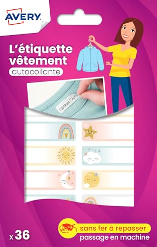 AVERY - 36 förtryckta självhäftande klädmärken, himmelskt mönster, storlek 4,5 x 1,3 cm
