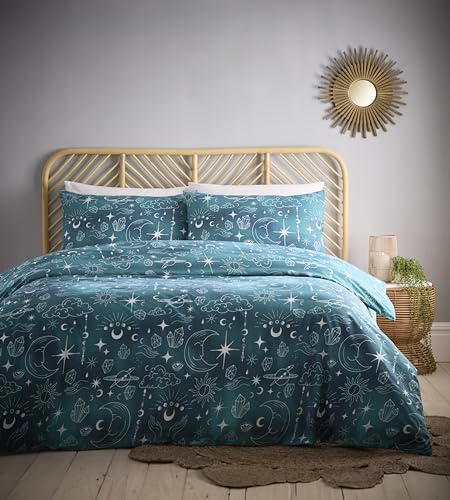 Charlotte Thomas himmelskt grönt påslakanset sol, måne och stjärnor sängkläder mörkgrönt sängfoder med örngott enkel