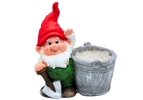 Dekohjälte24 trädgårdstomte med spade och hink som blomkruka, gjord av magnesia, söt dekoration för trädgård, terrass eller balkong, storlek: L/B/H ca. 19 x 26 x 33 cm, färgglad, 33 cm