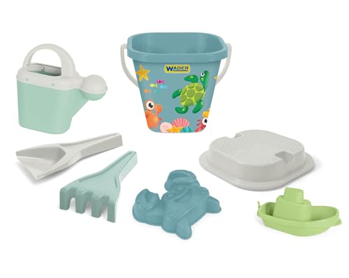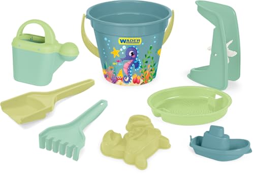 Wader 43230 – replay sandleksak med hink, spade, kratta, sil, sandformar, båt och vattenkanna, 7-delad strandleksak av återvunnen plast, från 1 år