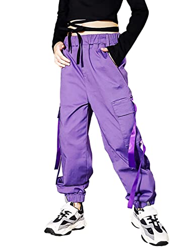 Rolanko Flickor Hip Hop Byxor Barn Cargobyxor Elastisk Jogger för Streetwear Dans, Lila, 10-11 År