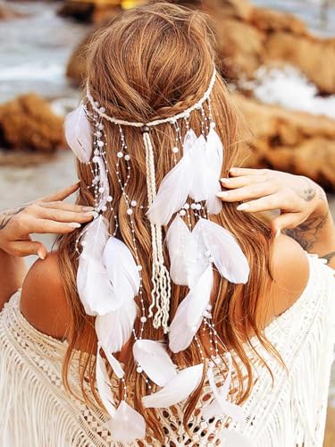 Zoestar Boho fjäder pannband vit pärla tssel pannband tribal fjädrar huvudbonad hippie huvudbonad festival kostym hårtillbehör för kvinnor