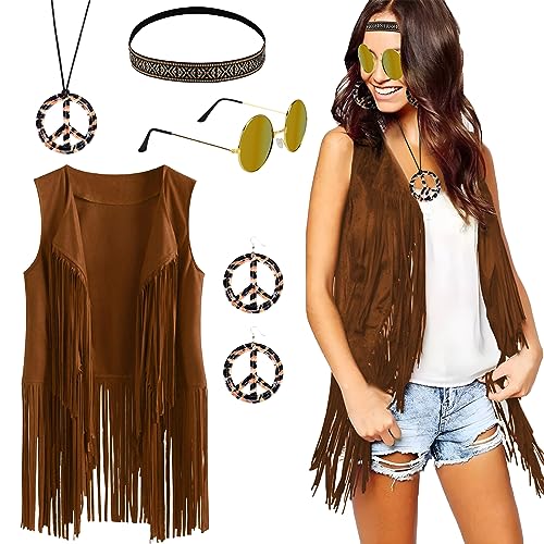CHMMY Hippie kostym kvinnor set 60-tal 70-tal fin klänning hippie kläder kvinnor brun tofs väst hippie tillbehör pannband örhänge halsband solglasögon för 70-talet kläder karneval halloween, Brun, XXL