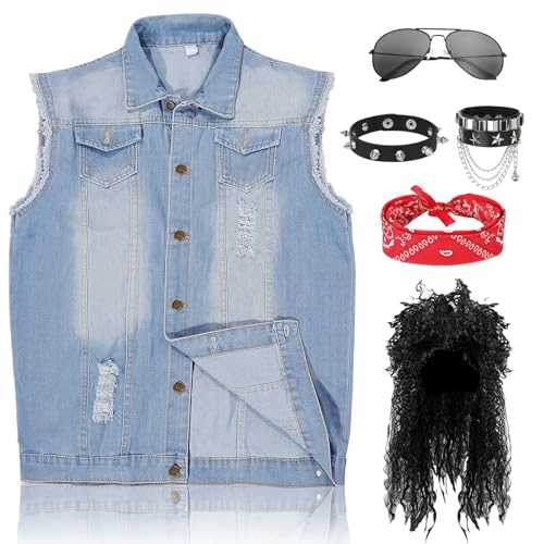 shengo 80-talet rocker kostym män, rockstar kostym rocker väst hippie peruk, solglasögon armband punk kostym rockstar tillbehör för karneval party 8090-talet kjol party karneval fest