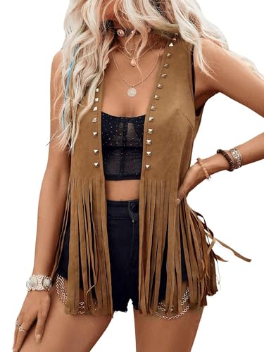 LYSINK Dam tofs väst 70-tal hippie cowgirl western falsk mocka nitar ärmlös frans väst streetwear ytterkläder, Ba mörkbrun, M