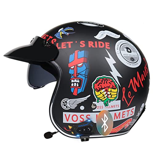 VVPEC Tysk stil Vintage Bluetooth Motorcykel Jet-hjälm Open Face Motorcykelhjälm ECEDOT-godkänd, Retro halvhjälm, med dubbelt solskydd och avtagbar insida(7,XL=61~62cm)