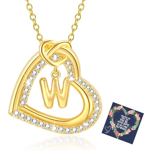 Halsband Kvinnor Silver Necklace Kvinnor Zirkonia Hjärta Hängsmycke Necklace med bokstäver A-Ö Halsband Dam Presenter för Kvinnor Flicka Flickvän 18 + 2 tum (Guld W)