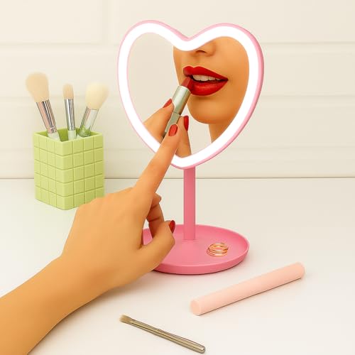 verybella Bordsmakeup Spegel Rosa Färg Hjärta Form Fast Bas I Kan Lagra Tillbehör Justerbara LED-lampor Touch Tändning Storlek Cm 285 x 18