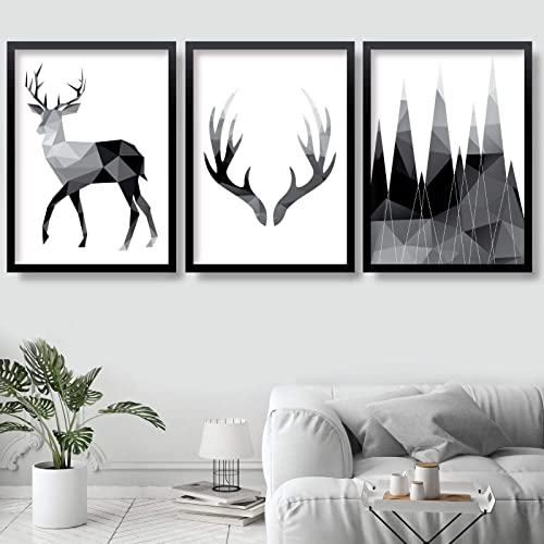 Artze Wall Art Geometrisk monokrom hjorthorn och berg konsttryck 3-delat set, 40 cm bredd x 50 cm höjd, svart/grå