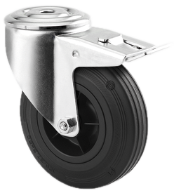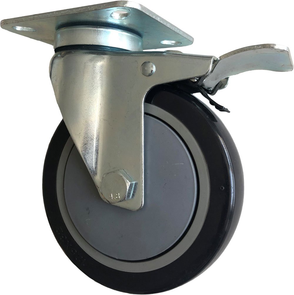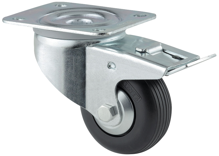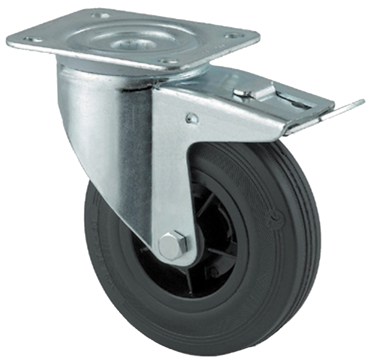 Svängbart Hjul Med Broms, Svart Massivt Gummi, Ø125 Mm, 100 Kg, Rullager, Med Platta Totalhöjd: 155