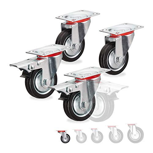 Relaxdays Tung lasthjul set om 4, roterbara, kullager, 2 hjul med broms, lastkapacitet upp till 320 kg, hjul D: 125 mm, svart