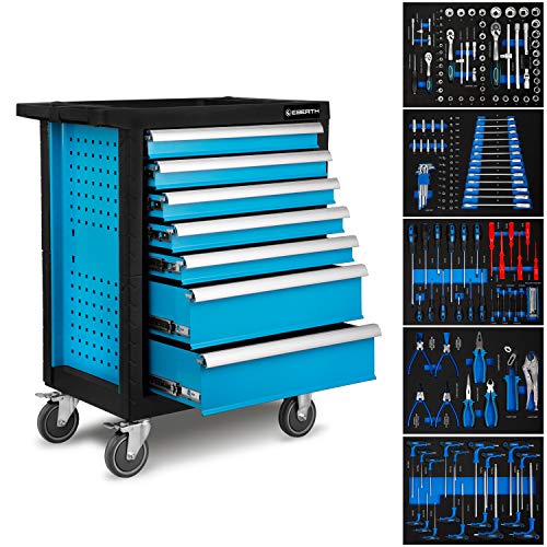 EBERTH Verktygsvagn 167 delar, 7 lådor, varav 5 är fyllda med verktyg, Dubbelväggig verktygsvagn av stål, Blå pulverlackering, Svängbara hjul, Låsbar broms, Ergonomiska handtag