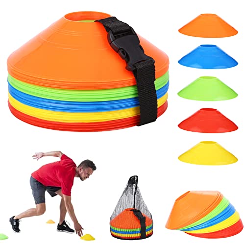 UNIDEAL 50 stycken markeringshattar, sporthattar med spännband, nätficka, fotbollshattar, set för fotboll, hockey, skridskoåkning, handboll eller träningshjälp för koordination (5 färger