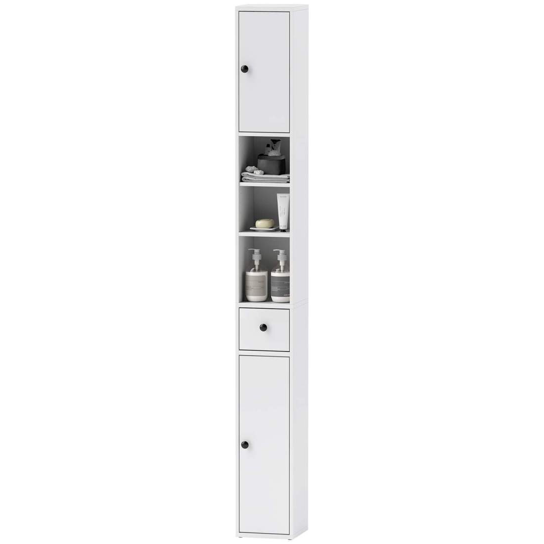 SoBuy Badrumsförvaringsskåp Högt, smalt, fristående badrumsskåp med dörr och 3 öppna hyllor, smalt skåp med 1 låda för toalett, sovrum, hall 40x161x35 cm BZR17-W