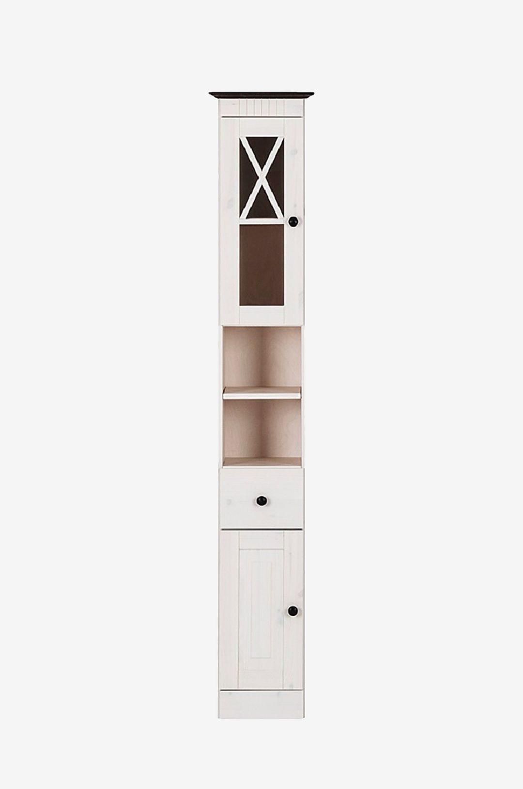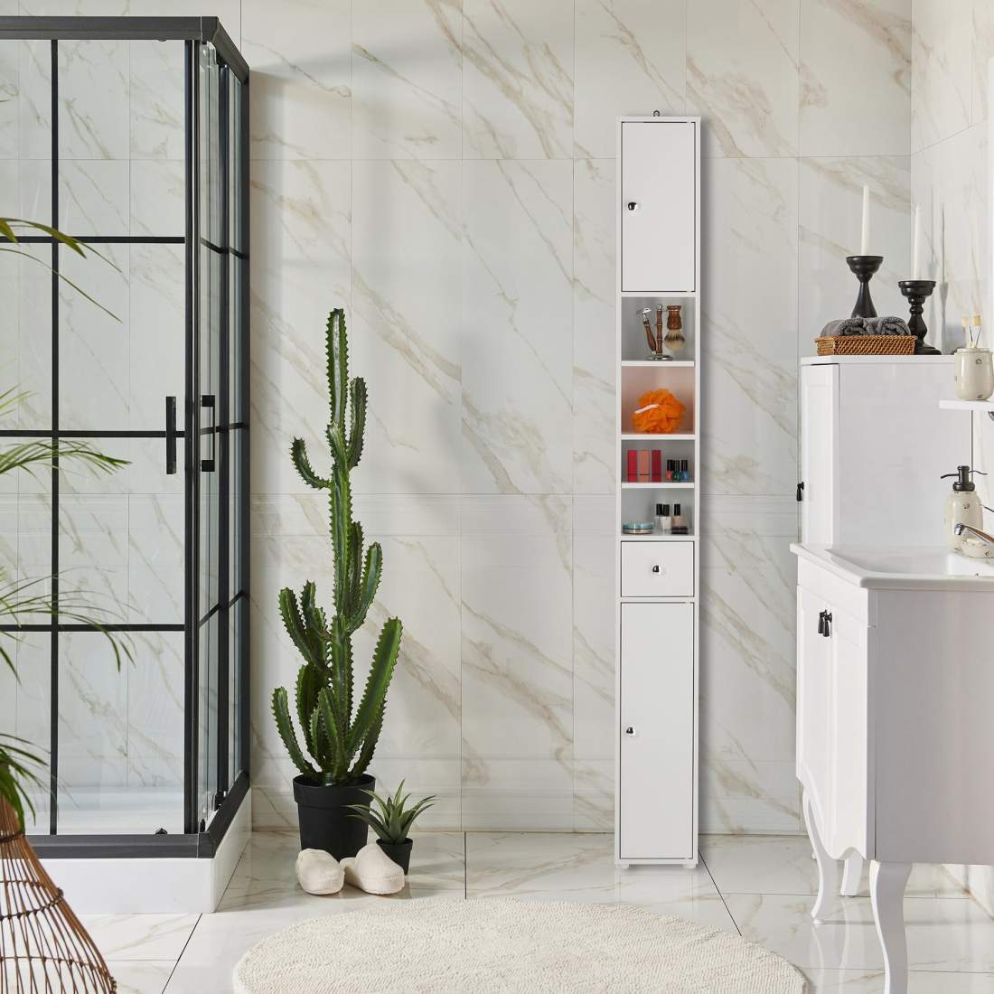 Högt vitt badrumsskåp med lådor och fack
