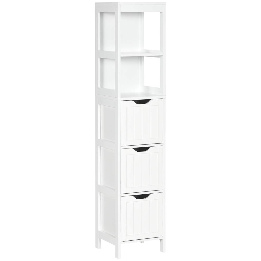 Högt badrumsskåp, slimmad design, låda, hyllor, skåp, spånskiva, vit