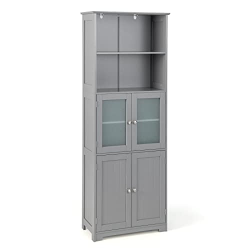 163 cm högt badrumsskåp Fristående förvaringsskåp med glasdörrar och justerbara hyllor Grå