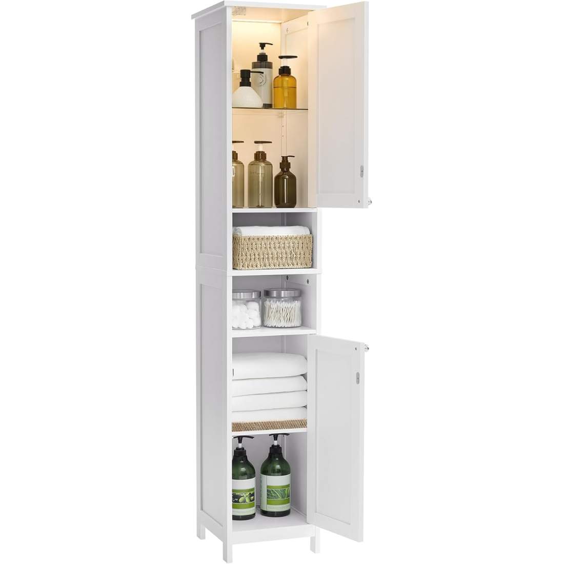 Bealife högt badrumsskåp, 170cm badrumsskåp med ställbara hyllor, badrumsskåp med öppet fack, låda och dörrar för badrum, vardagsrum, sovrum (Vit)