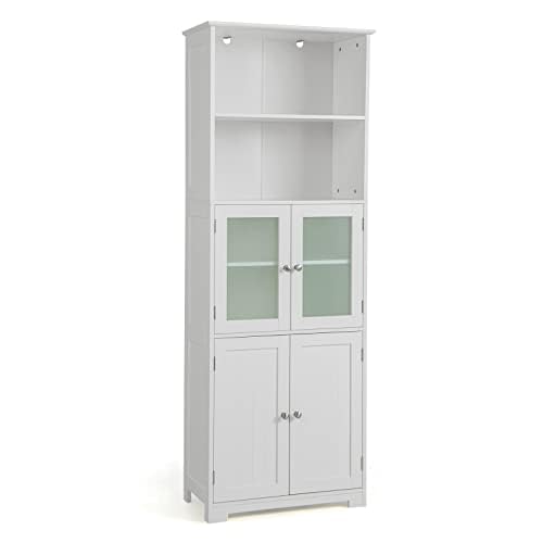 COSTWAY badrumsskåp med glasdörrar, 2 öppna fack och justerbara hyllor, högt badrumsskåp, badrumsbyrå förvaringsskåp för badrum, kök, vardagsrum (vit)