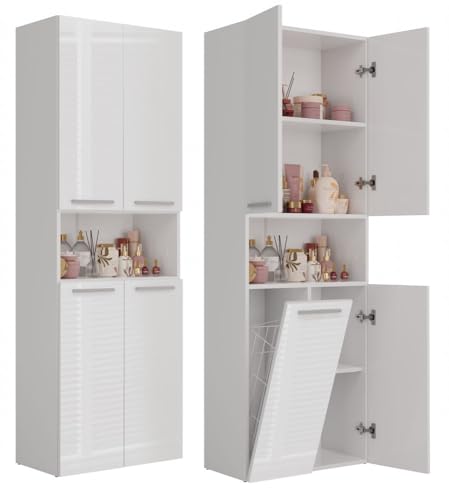 ADGO badrumsskåp med 1 tvättkorg, högt badrumsskåp, inbyggd tvättkorg, tvättväska, fristående förvaringsskåp (vit högglans/fram)