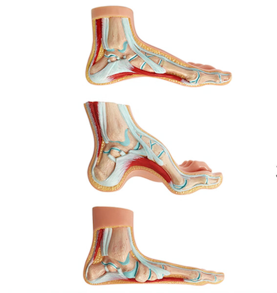 3 fot modeller - Anatomiskt av normal fot, en plattfot och en fot med högt fotvalv