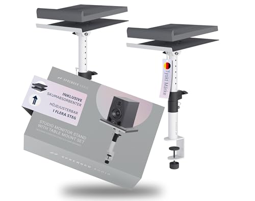 Sprenger Audio Högtalarställ med Bordsfäste – Lutningsbar ±20°, upp till 28 kg – Inkl. Skumdämpare – Stabil & Robust – för Studio, Skrivbord & DJ-bord - Vit