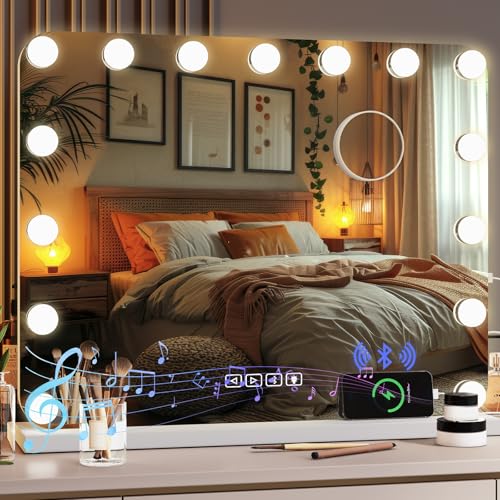 MAMIZO Bluetooth sminkspegel med belysning, Hollywood-spegel med ljus, 58 x 46 cm, 15 LED, dimbar, 3 ljusfärger, USB, 10 x förstoringsglas, vit