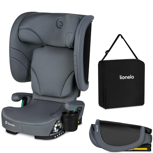 LIONELO Orin i-Size Hopfällbar Bilbarnstol 100–150 cm ISOFIX Lätt och Kompakt Resemodell med 14-stegs Nackstöd och 4-stegs Ryggstöd, Universell Passform, Brett Komfortsäte samt Transportväska – Grå