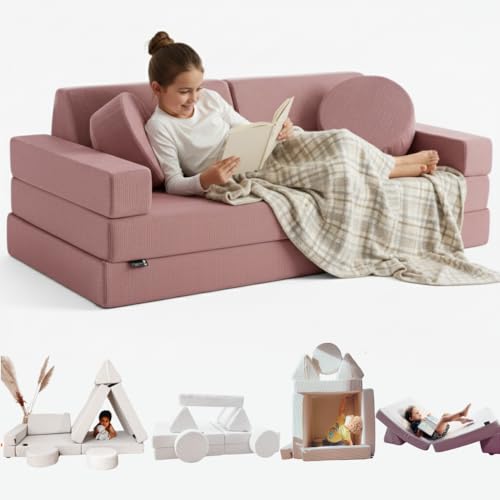 Modulär bäddsoffa för barn, 2-sits hopfällbar bäddsoffa, konvertibel till extrasäng, lekplats, fåtölj, golvmadrass (rosa)