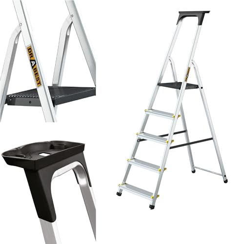 DRABEST Stege PRO-serien Trappstege Alu Stege 5 steg Hopfällbar med förvaring Hushållsstege Lastbar upp till 150 kg
