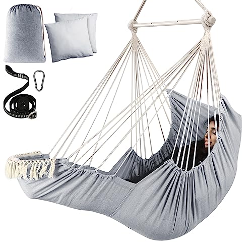 Chihee Hängstol hängande stol med fotstöd, 2 kuddar max 226 kg robust metall spridare bar hopfällbar enkel förvaring mjuk bomull gungstol stark rem järn karbinhake sidoficka ingår