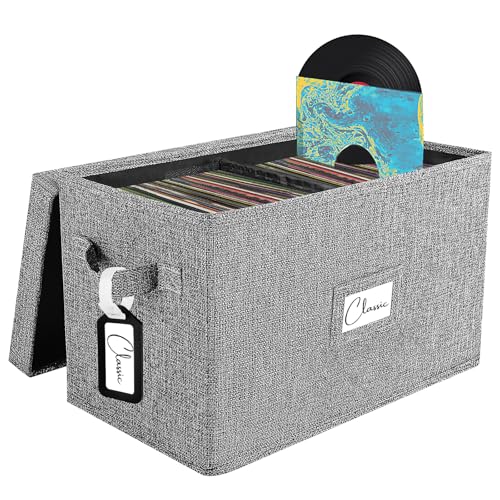 Förvaringsbox för vinylskiva för 7 tum/45 RPM LPs, grått fodral med lock rymmer upp till 80 album, CD-låda spela musiksamlingshållare, hopfällbar arkivmappskåp organiserare med handtag