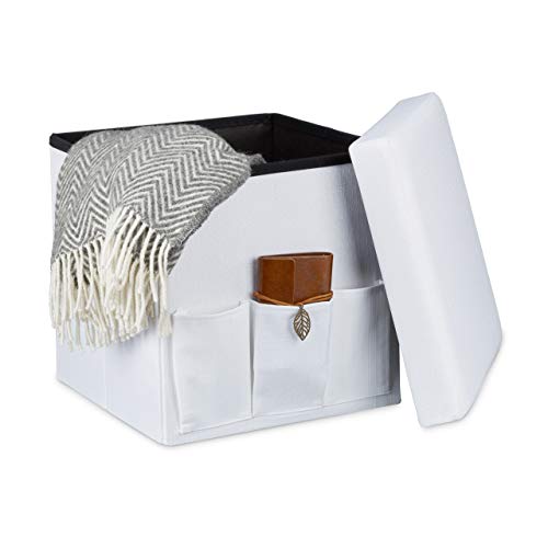 Relaxdays hopfällbar ottoman-puff 38 x 38 x 38 cm robust sits med 3 sidofickor, hopfällbar fotpall, förvaringsbox, vit, linne