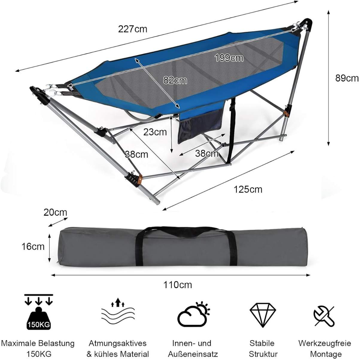 Hopfällbar hängmatta med stativ och sidoficka – Blå
