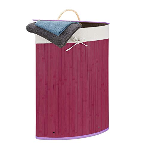 Relaxdays hörnkorg i bambu, 65 x 49,5 x 37 cm, 64 L, hopfällbar korg med tvättsäck, lila
