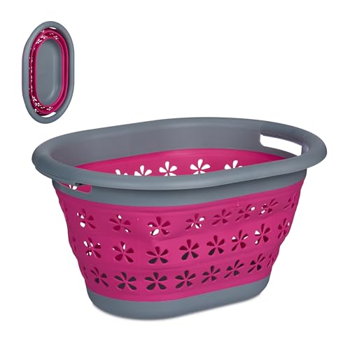 Relaxdays Tvättad hopfällbar korg, 17 L, plast, med bärhandtag, 26,5 x 50,5 x 37,5 cm, tvättkorg, rosa/grå