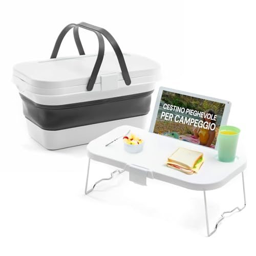Hopfällbar picknickkorg med bordsskiva - Hopfällbar korg för strand och camping, i polypropen, 16L, vit och grå, 47,3 x 9–24,5 x 29 cm