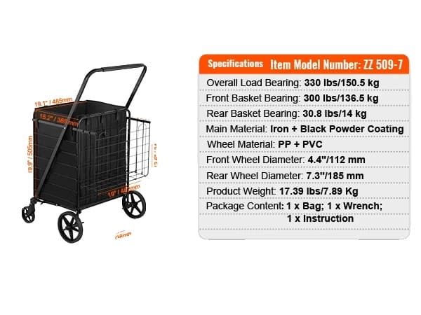 Hopfällbar shoppingvagn, avtagbar vattentät innerfodral, stor kapacitet, 330 pund