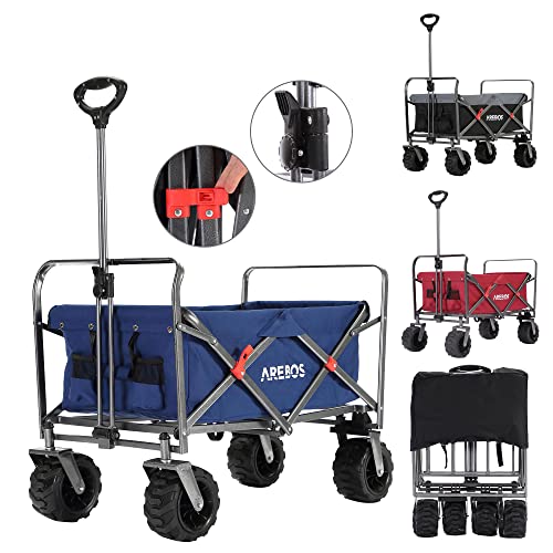 VILLEY Hopfällbar hopfällbar vagn med stora hjul, alla terränger strandvagn kraftig vikbar, förstorad 102 kg kapacitet, bärbar verktygsträdgårdskvagn med 2 kopphållare och broms, blå